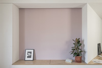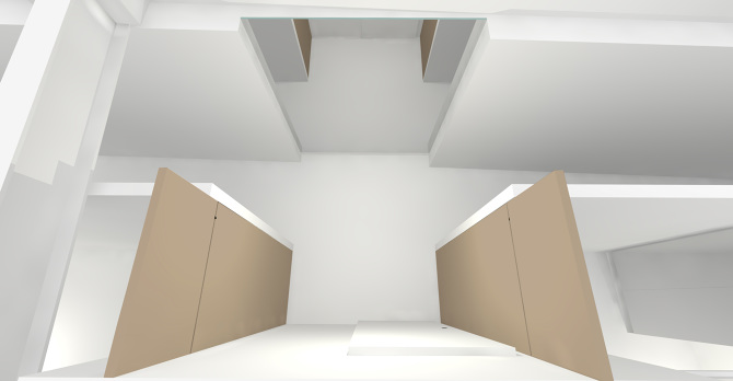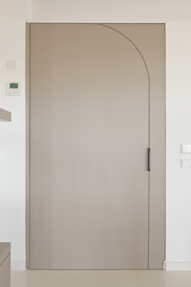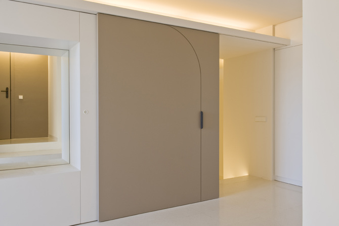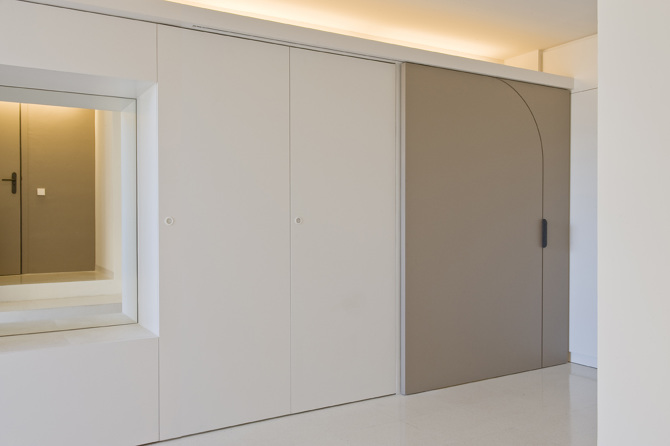 Entrance to bedrooms is through a pivoting door, floor to ceiling and wall-to-wall, no doorframe and painted in the project colour.