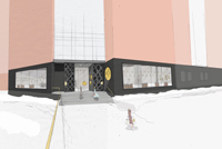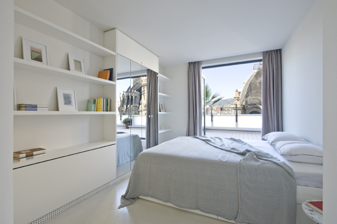 The fourth is the master bedroom, hosts a bigger closet and a desk. A special bathroom was designed to incorporate one of the sloped volumes;it has a large masonry bathtub with double shower-heads; the shower has special view on the Fenix building dome across the street, through its light-well.