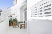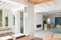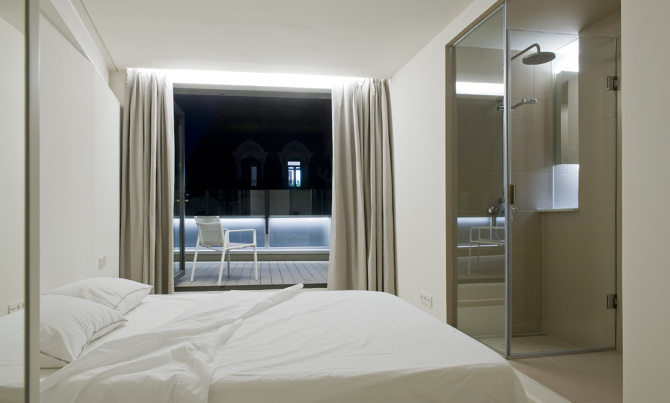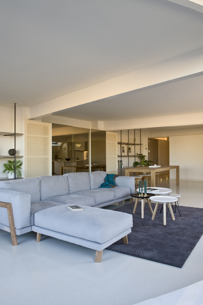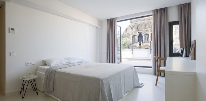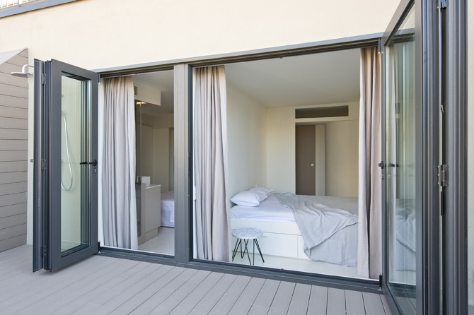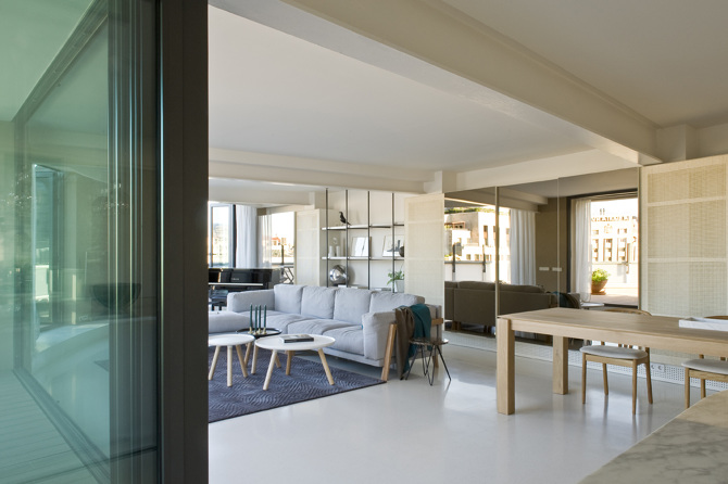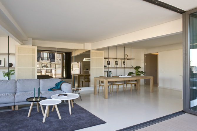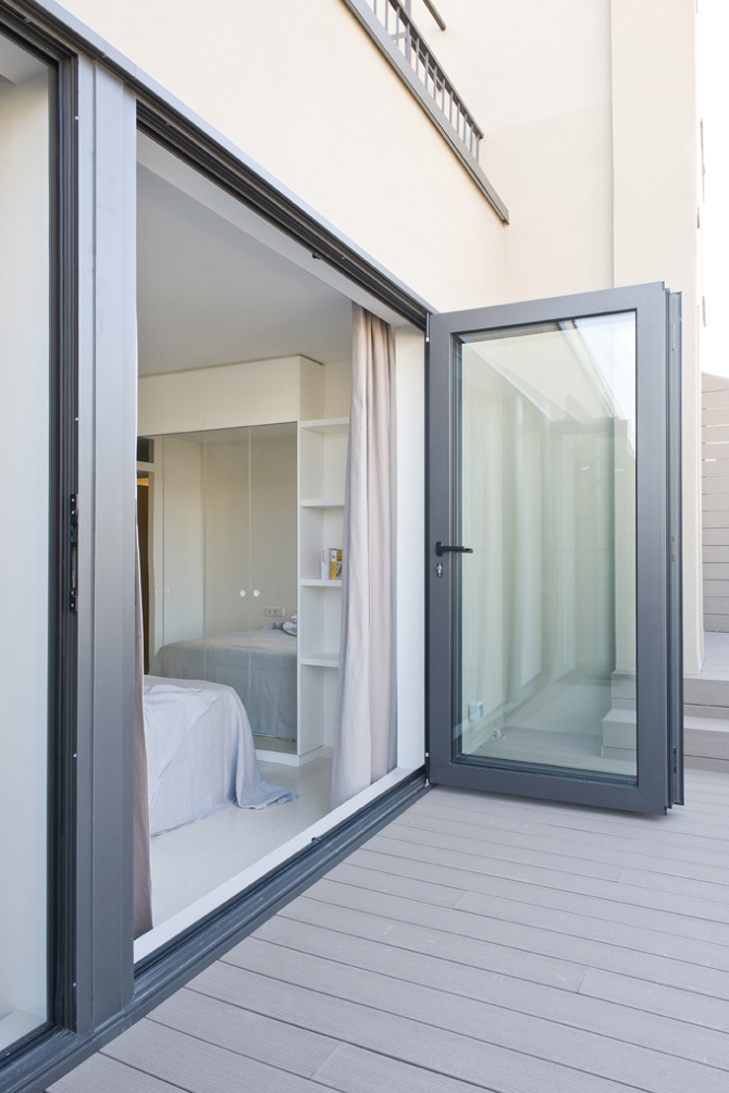 To avoid having to pass through the bedrooms area to reach the living area, we created a closed box for the private night area (that includes a corridor) and a second day area circulation by opening a doorway to the terrace that leads directly to the day area.