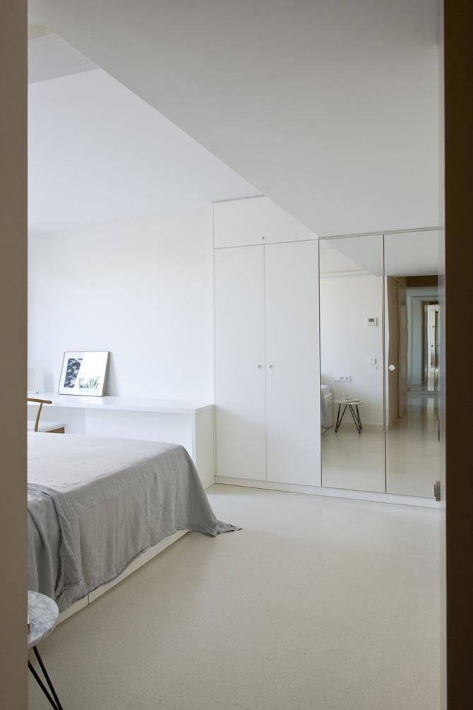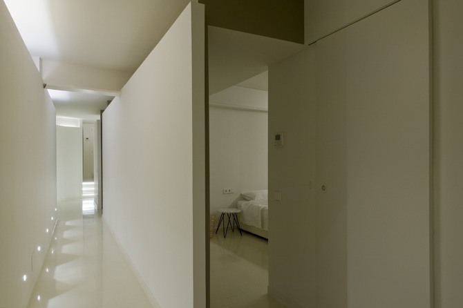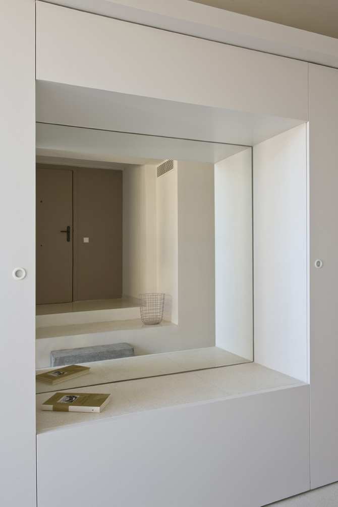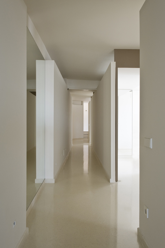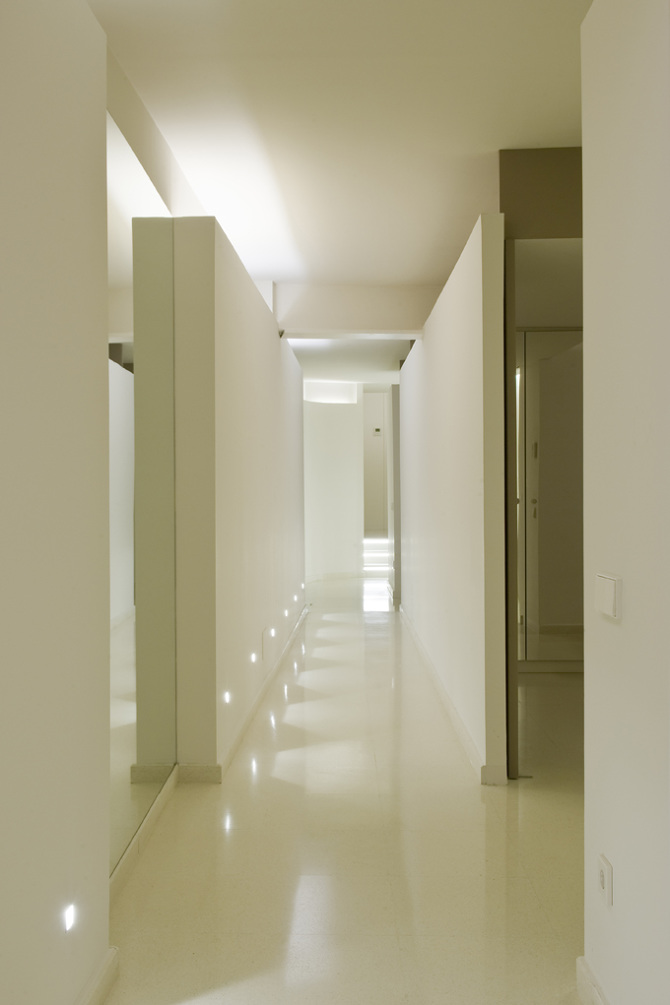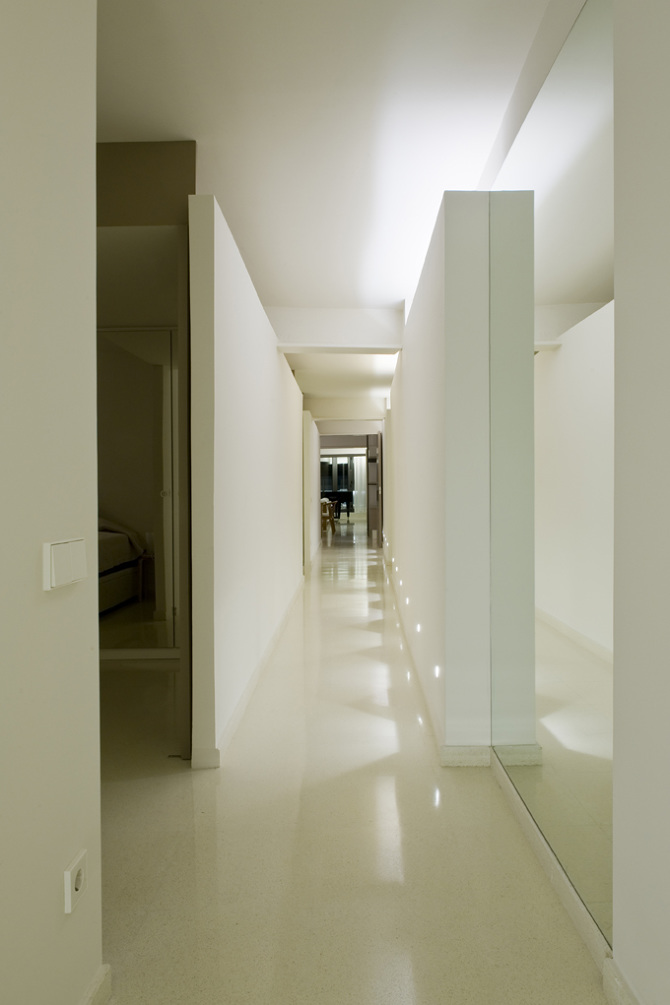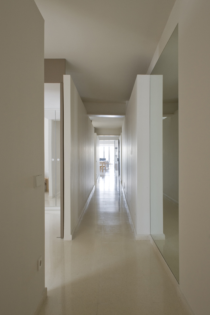 To avoid the space feeling like a tube, the corridor widens in two points where the entrances to the bedrooms are facing. Two big mirrors also enlarge visually the space.