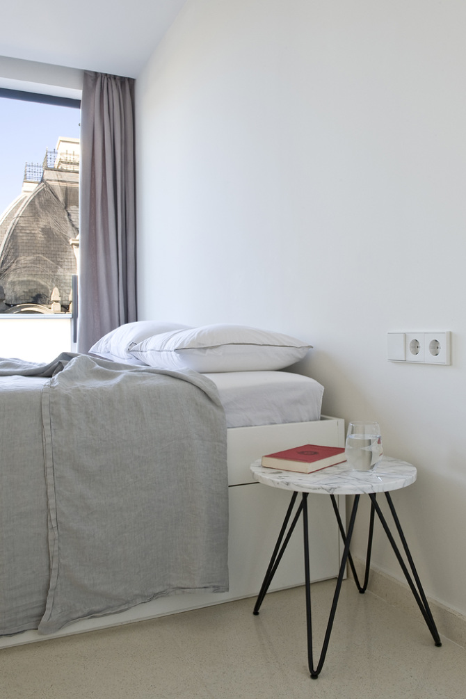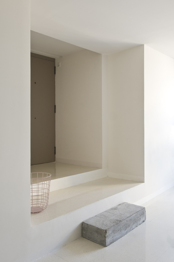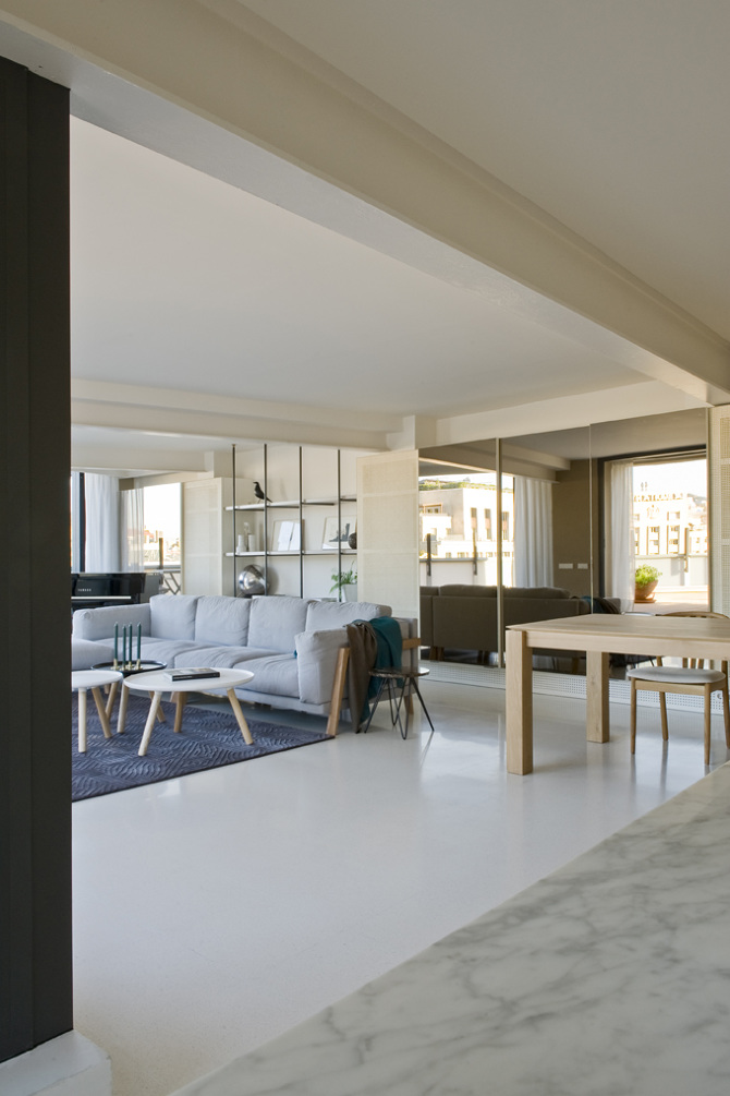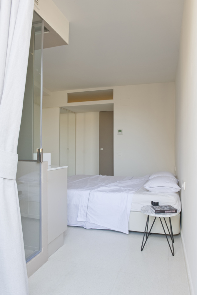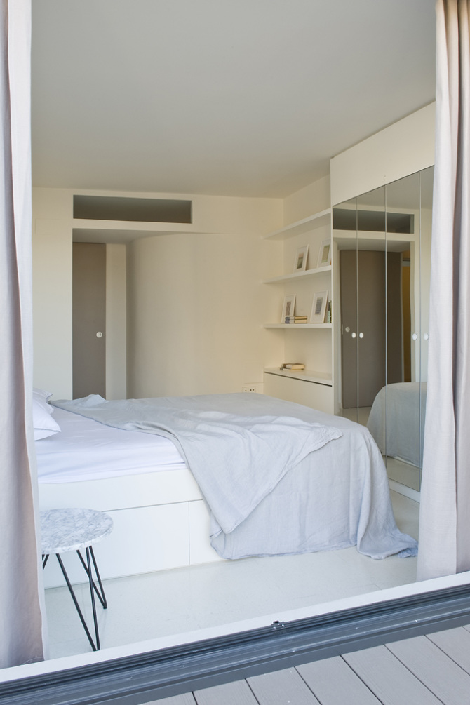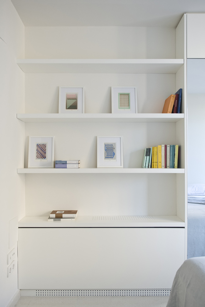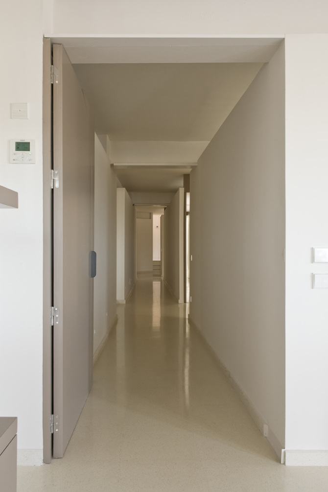 To avoid the space feeling like a tube, the corridor widens in two points where the entrances to the bedrooms are facing. Two big mirrors also enlarge visually the space.
