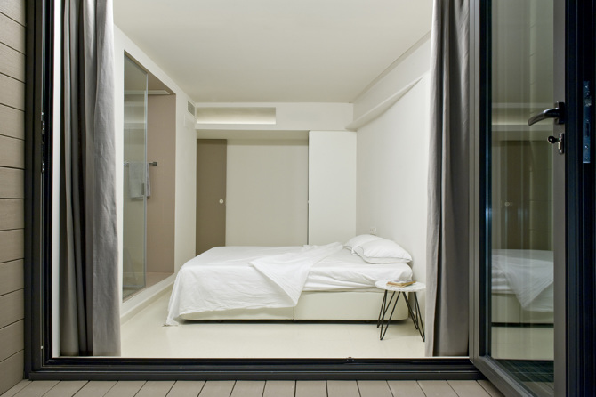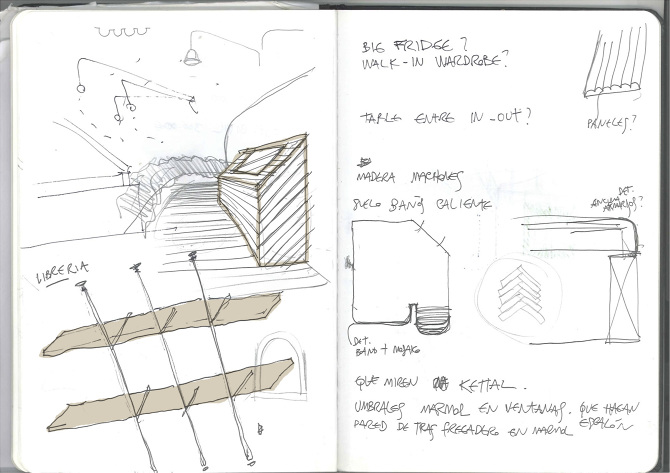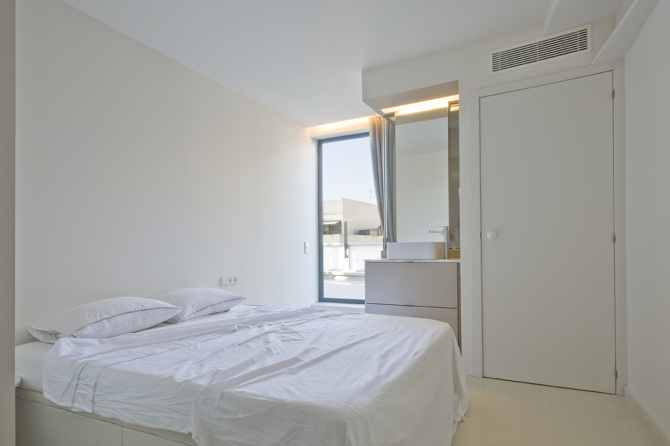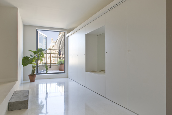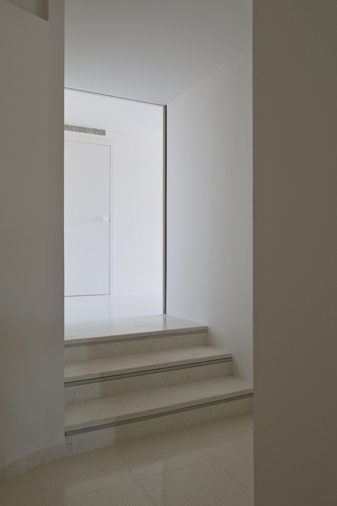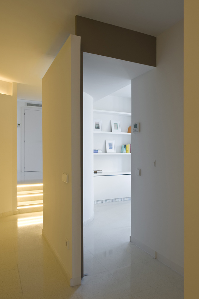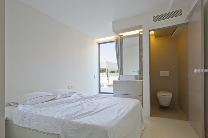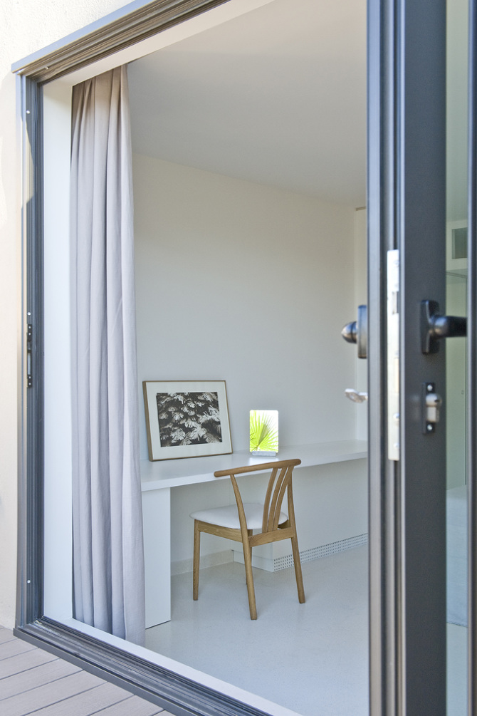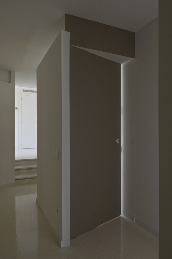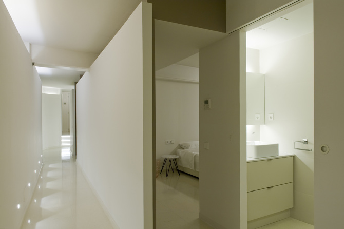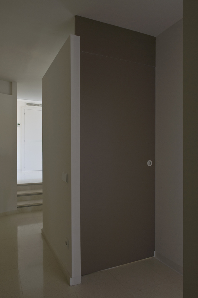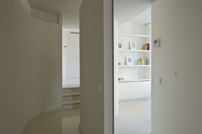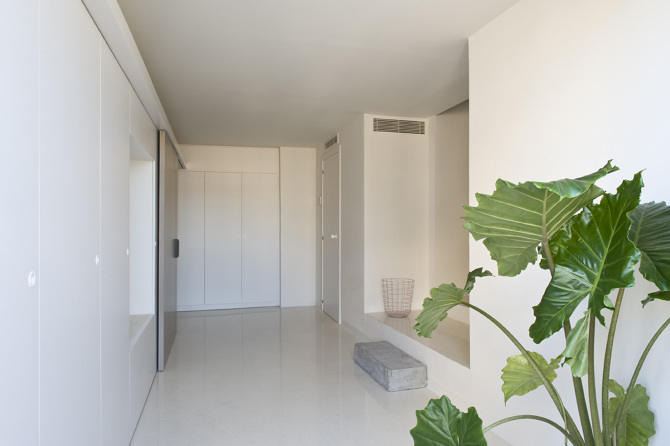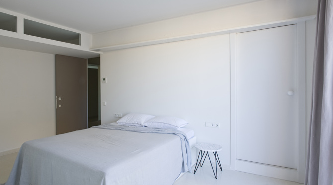 The entrance is raised, and three steps down you find the hallway, where a wide glazed door opens to enter the great terrace. A Line of storage units hidden behind white panels incorporates all the machines for hot water and air cooling and heating. In the middle of these units there’s a seat to take off shoes (a habit of the Norwegian clients), with a square mirror. The double-height of the entrance wall can be overcome by stepping on the concrete step. A big sliding door with leads to the “bedrooms box”.