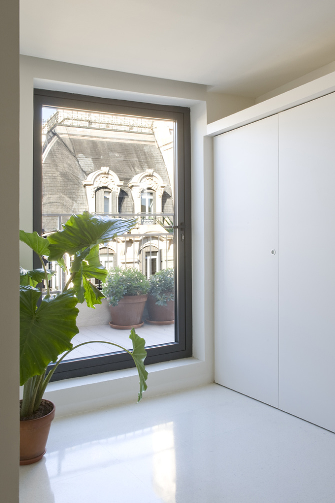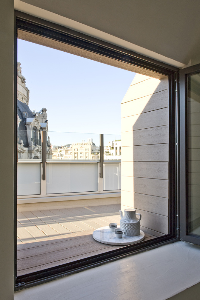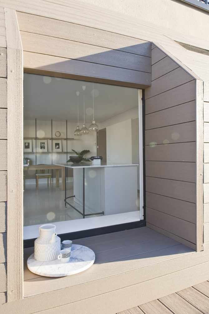 Next to the kitchen sink, a square window opens up and special seat is placed on the window-sill, the perfect place to contemplate the skyline.