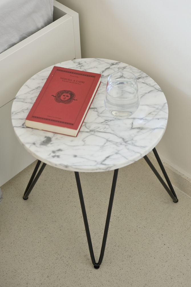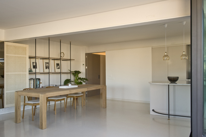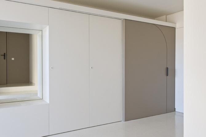 Curve – The project restores the building’s curve facade by getting rid of roller shutters that cluttered the facade. This newly discovered curve becomes one of the guidelines of the project. To emphasise it on the inside, a white step covered in white Pandomo continuous coating is built around the living space, matched on the ceiling with it a curved line of curtains. The curtains pass from inside to outside, in the area of the outside dining table, visually blurring the limit between indoor and outdoor. The same curve motif appears in the slot line drawn on the doors closing the “bedroom box” in the shape of the corridor towards the entrance, and in the rounded corner of the marble kitchen island.