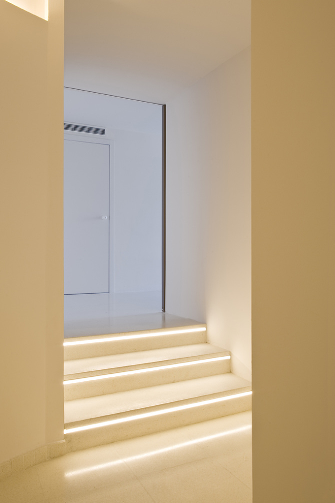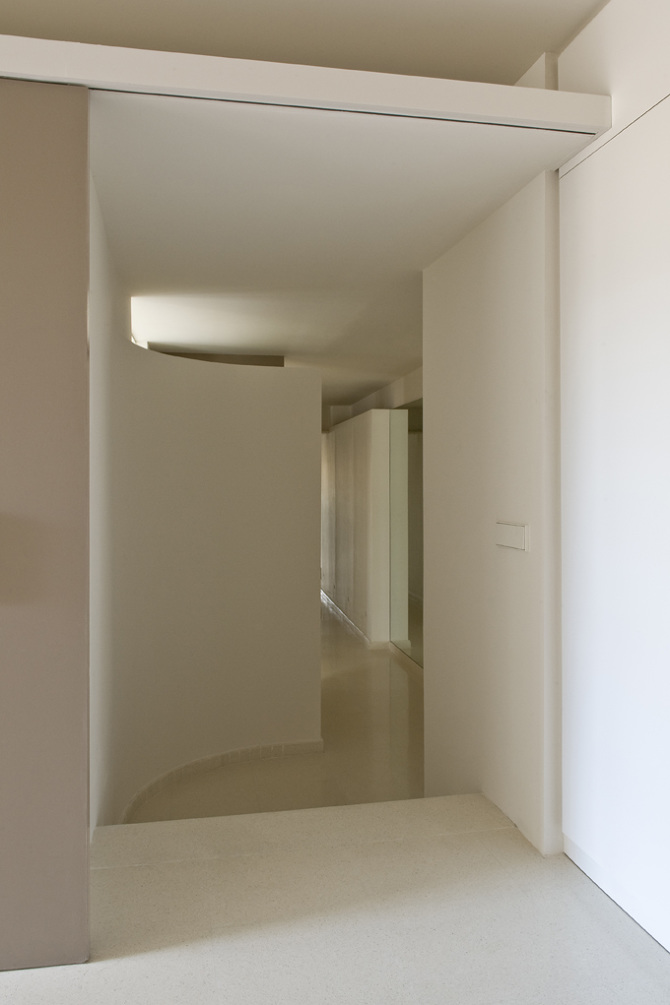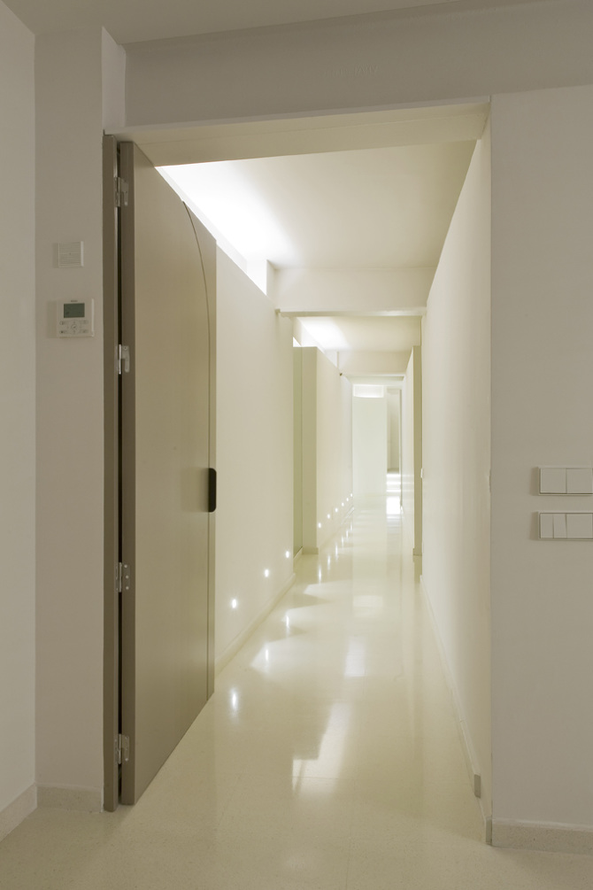 A lower ceiling area between corridor and bedrooms allows natural light to enter the corridor space. Indirect lights illuminate the ceiling from above the volumes placed on the boundary walls. The same volumes are pierced in their lower part by a line of LED spotlights by Viabizzuno, pointing at the floor. This light source allows to light the corridor without interfering with the bedrooms (at night, i.e.), as placed far from the line of windows between corridor and bedrooms.