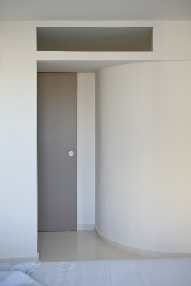 The curtains that follow the curve of the living space on the inside, suddenly appear in outside space, as if they were going through the thick facade pillar; they multiply the chances for screening and adding privacy, while softly swinging in the breeze. Their fabric is an outdoor textile that has been carefully chosen by Gancedo for its lightness and resistance.