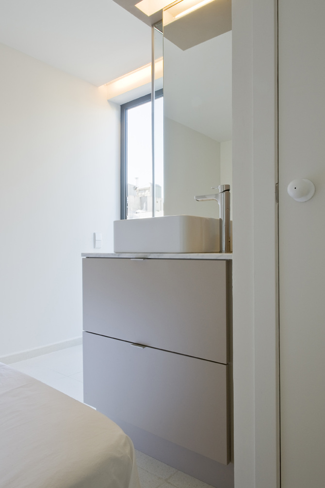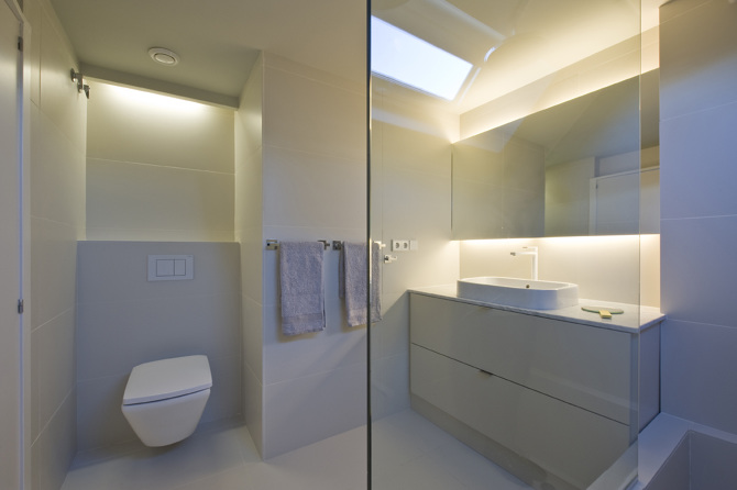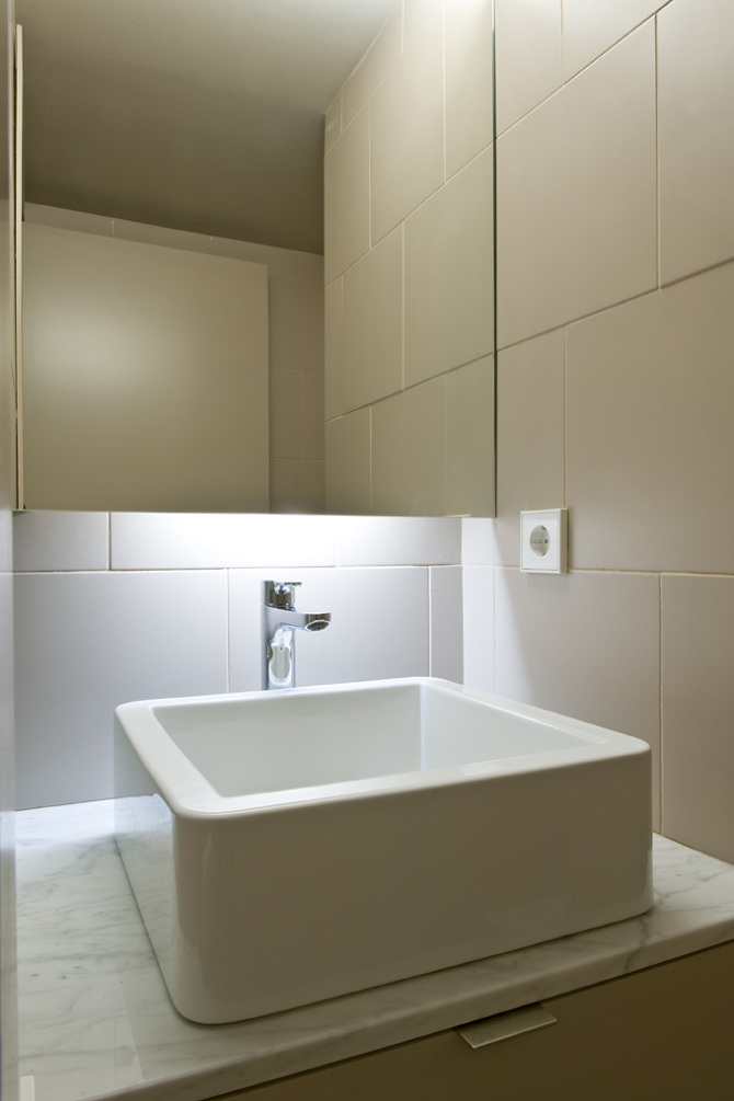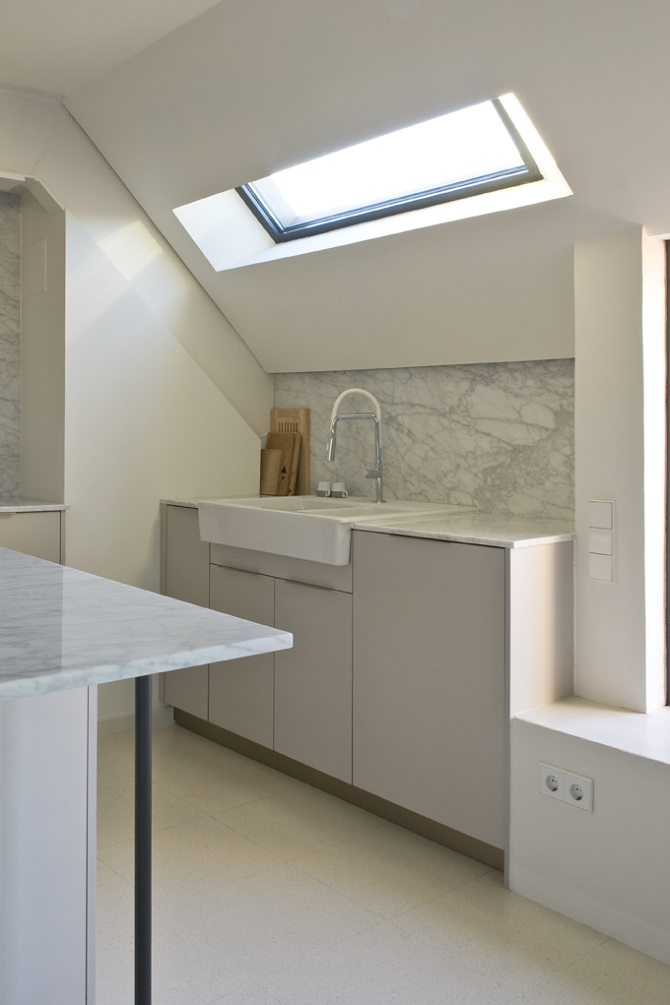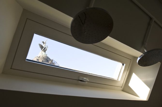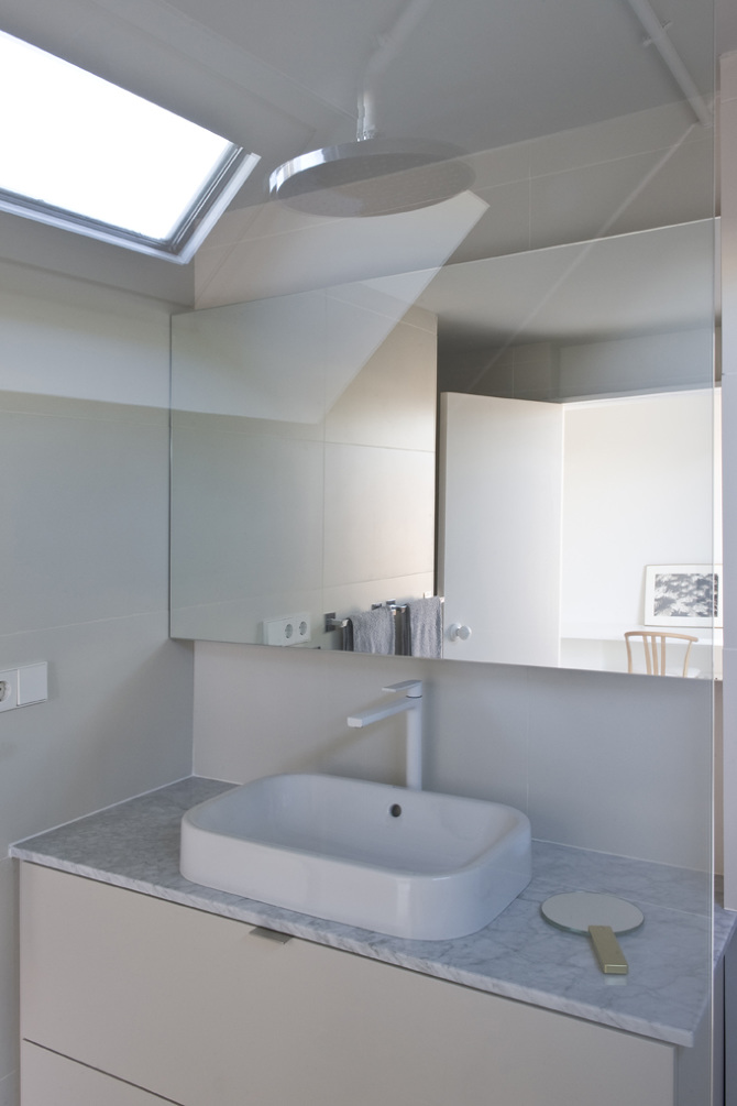 On the second wall, the sink is placed strategically under the light well to allow views of the dome in the facing building. A line of lights is hidden behind the sloping roof.