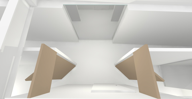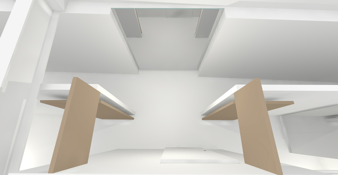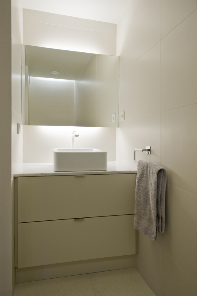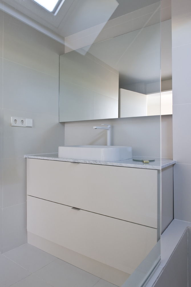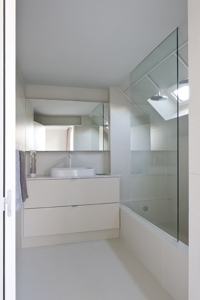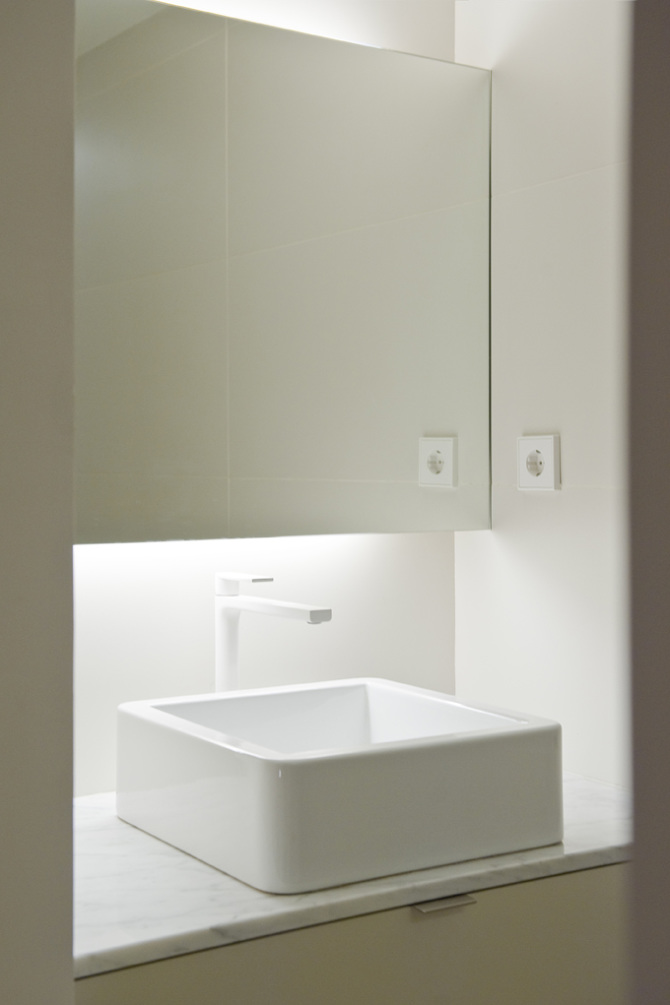 On the second wall, the sink is placed strategically under the light well to allow views of the dome in the facing building. A line of lights is hidden behind the sloping roof.