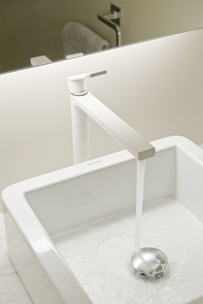 Master bathroom and courtesy toilet, sink Roca Diverta with high mixer tap by Gessi Via Manzoni, matt white. Shower and bathtub taps by Gessi Via Manzoni, matt white.