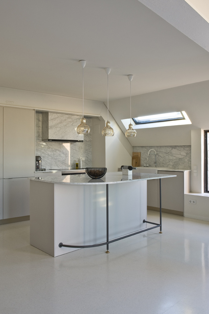 The central island completes the kitchen allowing extra storage and creating a breakfast table where its white marble slab has been cut with a curved shape.