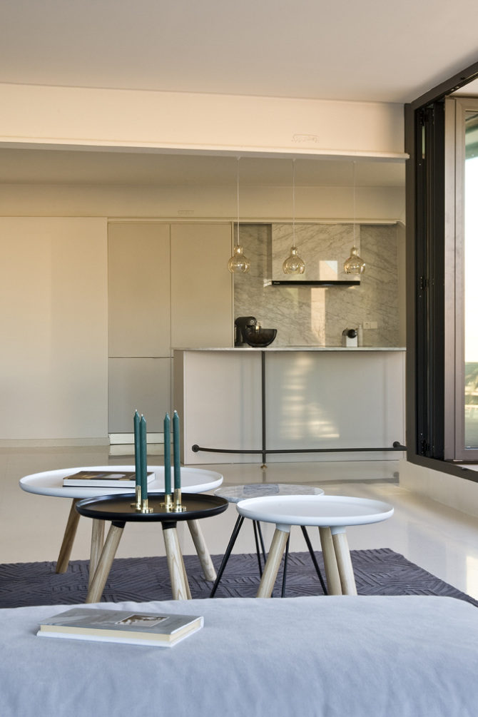 The kitchen occupies a corner of the living space. The units are split on two walls. On the first are placed two fridges, hidden behind doors and the electric fires. The kitchen hood has been completely clad in white marble, just like all tops and dashboards.