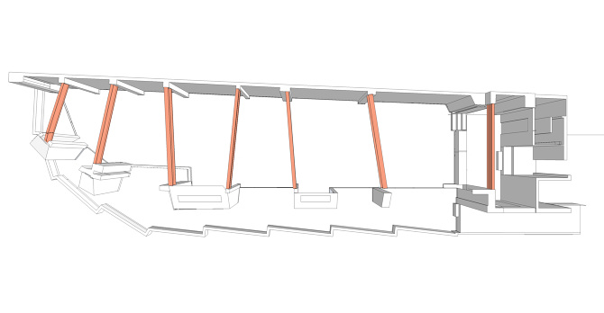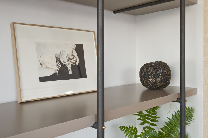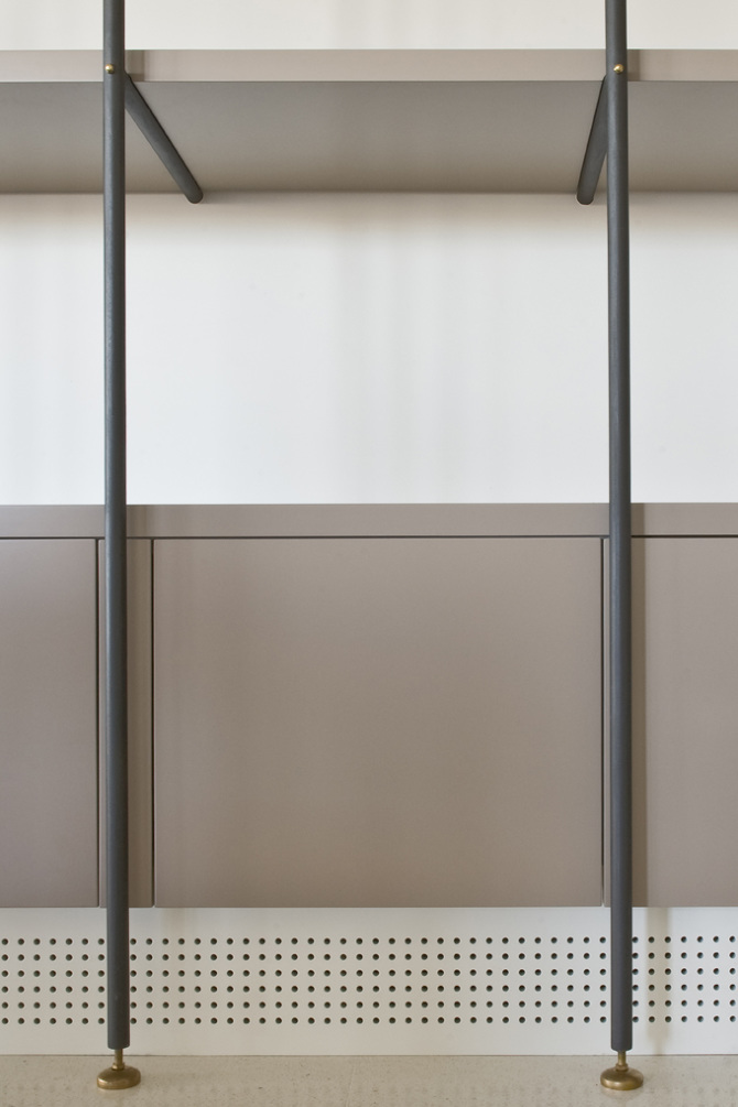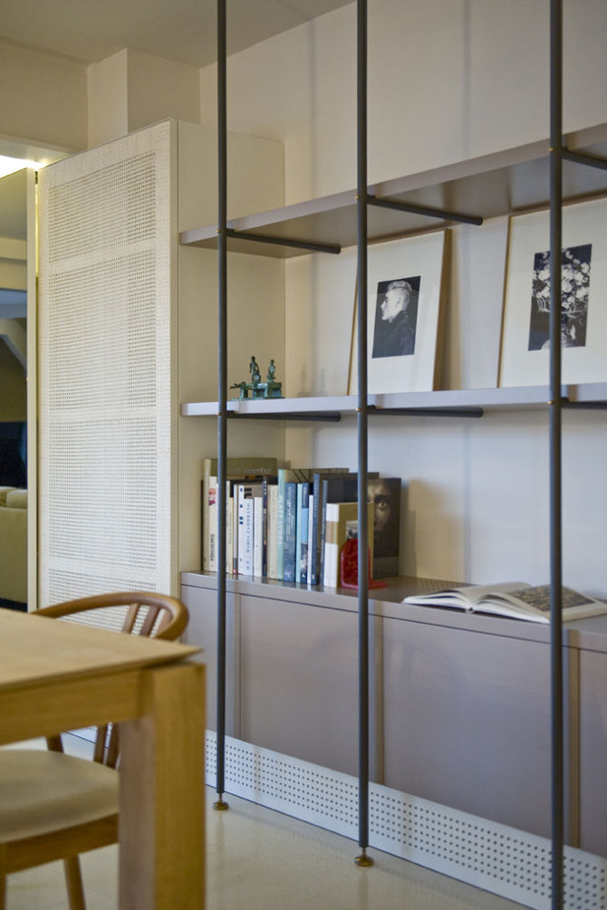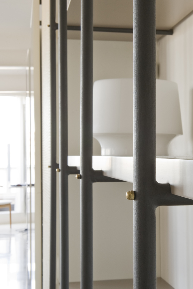 The library has a black metal tubular structure detailed with brass feet and bolts, and its thick cylinders bear broad shelves as they cage the low units that disguise the air conditioning devices. The skirting board in the lower part of the units is perforated to allow the machines to ventilate; it has the same high as the curved Pandomo step that projects from the terrace.