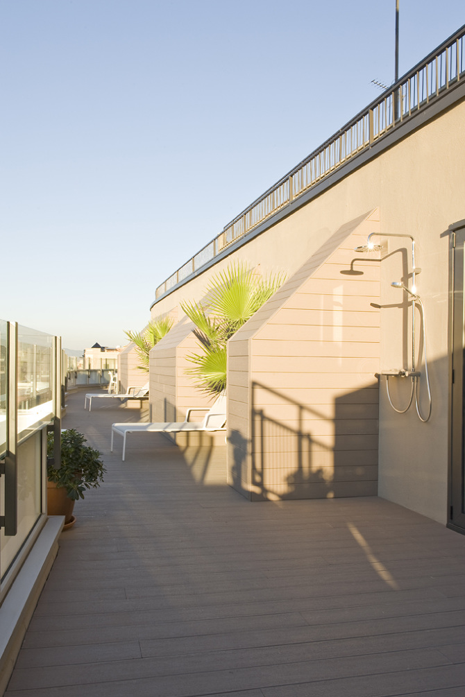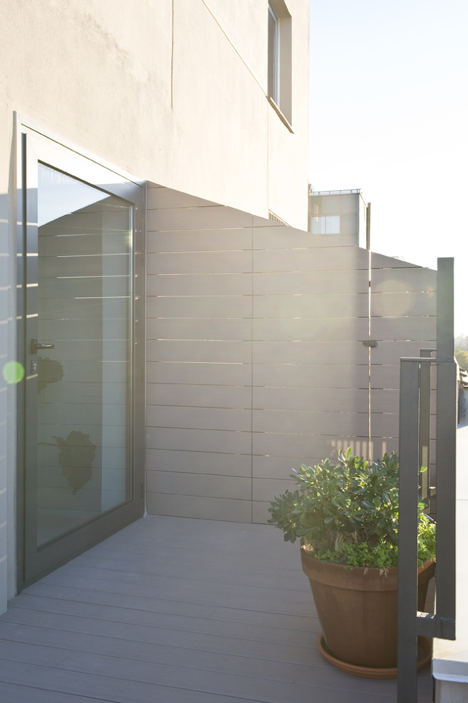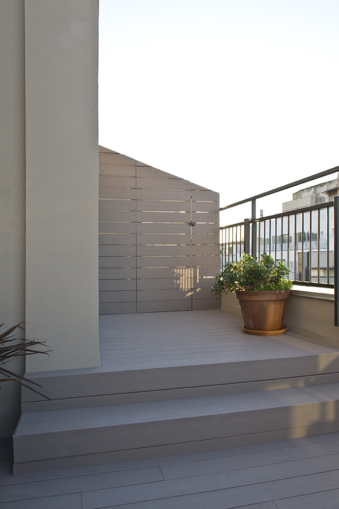 The upper part of the terrace hosts a laundry area, to wash and dry clothes away from sight. This part is screened by a partition, a fence cut at an angle and clad in the same material as the deck. The same material is used to clad the structural volumes protruding on the terrace, visually integrating their sloped shape into the solarium.