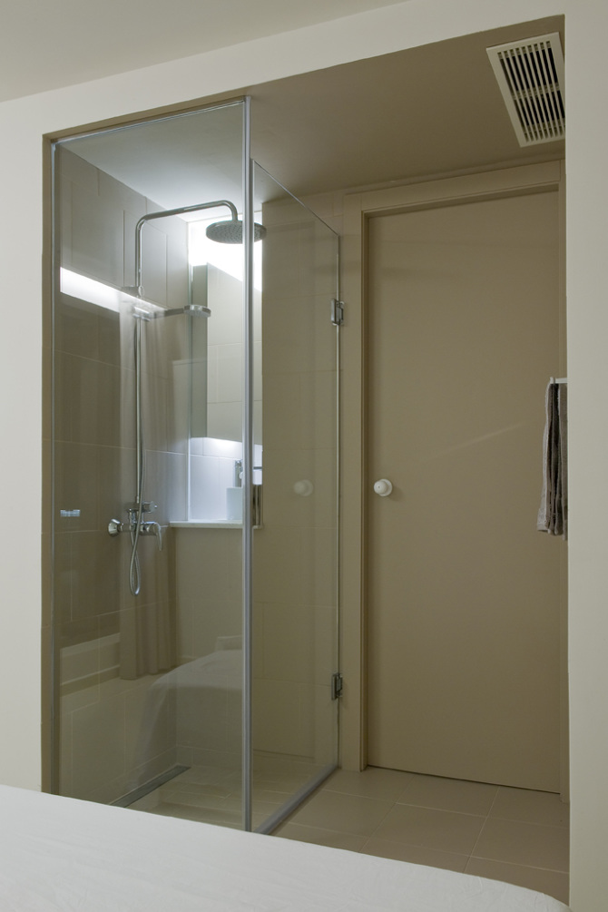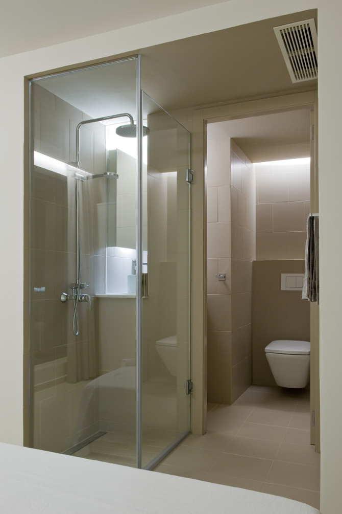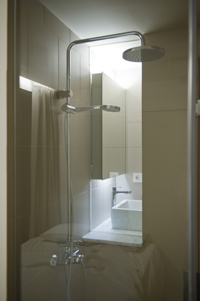 The third bedroom has a bigger bathroom set into a niche, that takes natural light through the shower box, placed in the room.