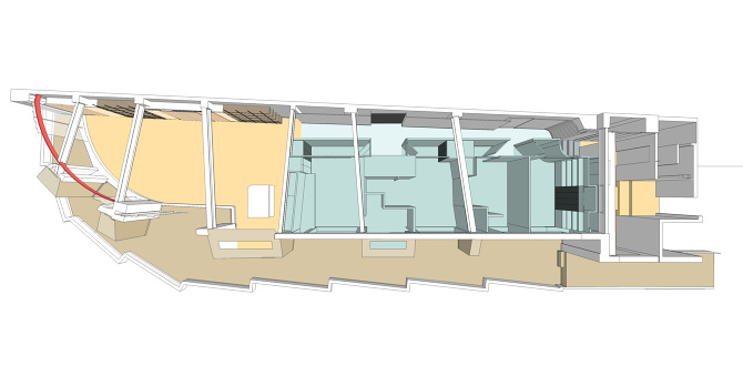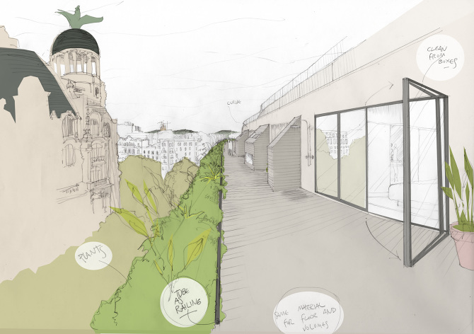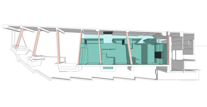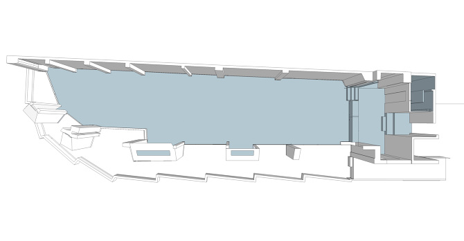 Its elongated shape terminates in the newly discovered curved shape of the building as it faces the corner of Paseo de Gracia.