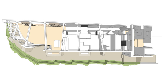 Its level is higher on the entrance side, where the access is, from where its whole length can be appreciated. Every bedroom can be opened completely and the existing sloping volumes of the facade create more private spaces in front of each room.