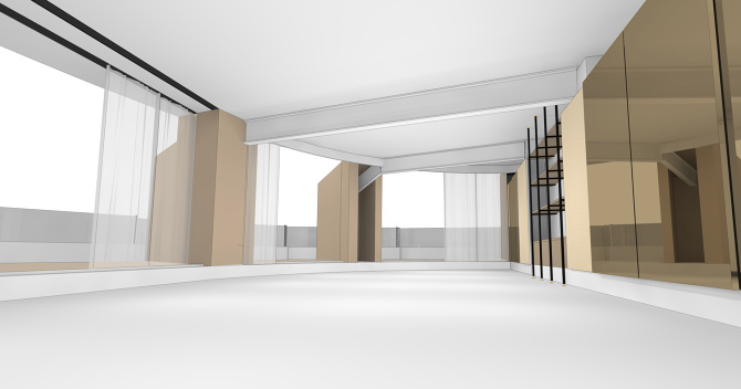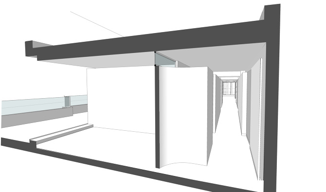 The corridor is accessed through big doors at the extremes, one sliding on the entrance side and one big pivoting one on the living side. It widens as you move through it and it’s pointing straight at one of the big windows of the living space.