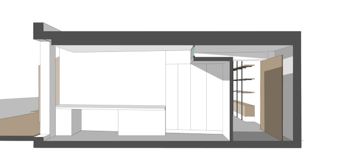 Night area box - This night area box is visually placed below the thick and heavy beams that cross the apartment. Different heights were used to emphasize the feeling of a box below the beams and bring natural light into the corridor. Two lines of light are placed in the corridor: one is hidden in the volumes