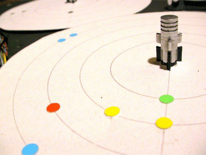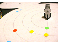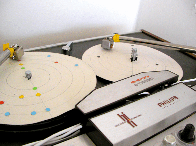 Drum Phil is an analogue drum sequencer built from a modified reel to reel tape player. Paper disks can be played with preprogrammed rhythms or the stylus mounted tape heads can be removed and used to manually tap out beats by touching the coloured dots. The data stored on credit cards and train tickets etc is what creates the sound.