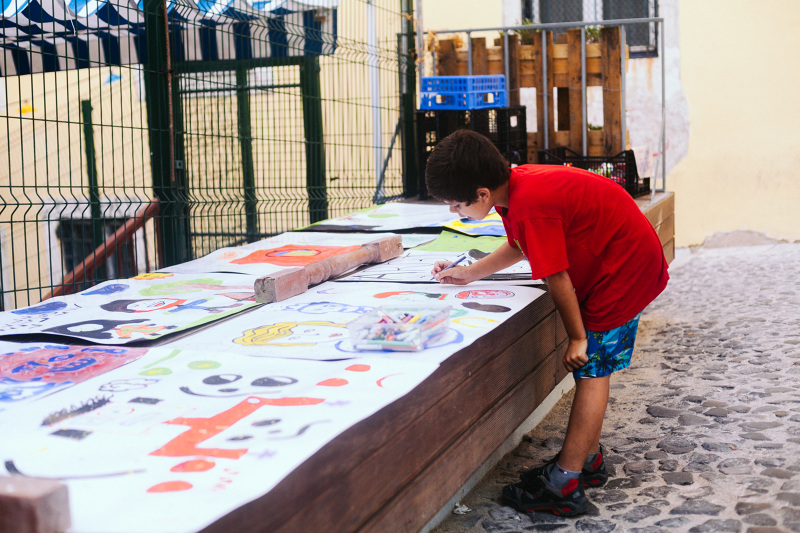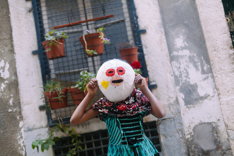 Oficina de "máscaras de balão" - a partir de um simples balão e de folhas de jornal criam-se máscaras originais imaginadas por cada participante.