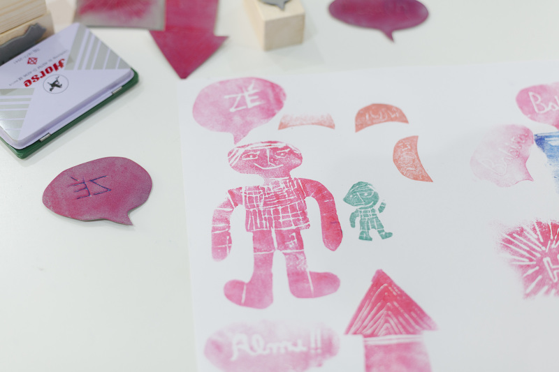Oficina dos Carimbos - a partir da manipulação e desenho manual sobre folhas de EVA explora-se a criatividade de cada criança e estimula-se a capacidade de contar e imaginar uma história.