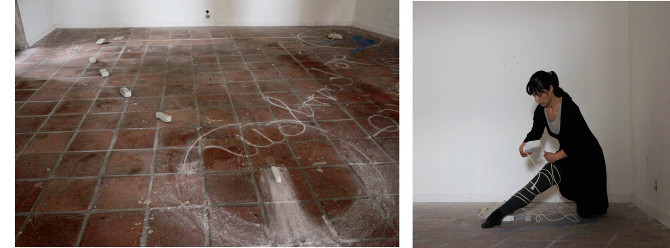 Os repertórios biográficos e visuais do desenho e do gesto traduzem-se num processo de simbiose, de diluição de fronteiras desses campos expressivos. A sua materialização num contexto performativo, acenta na relação que se cria entre o corpo e o meio onde se inscreve, através dos procedimentos adoptados, de gestualidades, e grafias com que se ensaia uma composição. “Um canto de passagem”, é uma variante do um ensaio anterior ” Um quarto cheio pela ausência”, que pretende construir uma nova experiência através do repertório visual e gestual da primeira acção, testando novas possiblilidades de experiência individual e de descoberta entre o que acontece e os vestígios que vão construindo a narrativa.