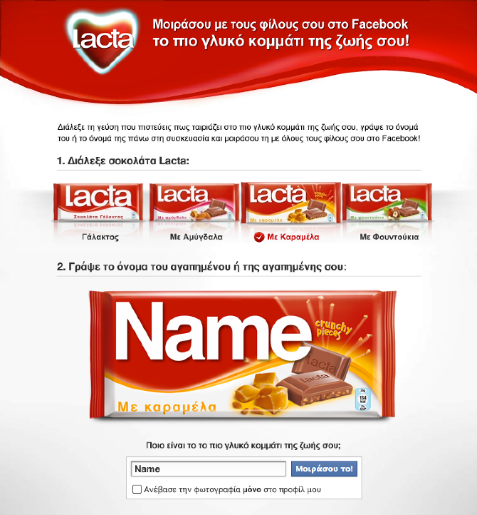 Developed at OgilvyOne Athens for Kraft Hellas, a Facebook application which let people to customise a Lacta chocolate package with the name of their loved ones. Then the customised package was shared using wall to wall post feature.