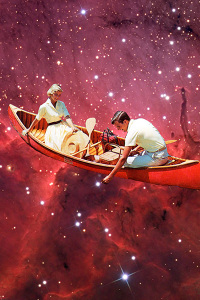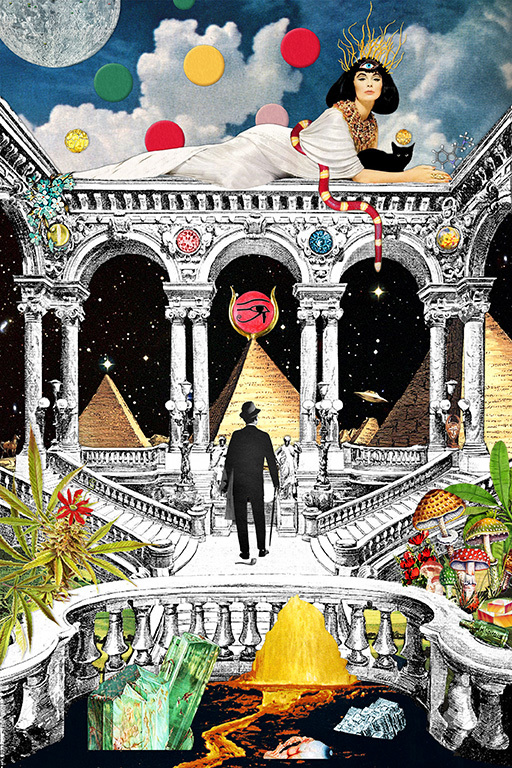 At the very top, the Ascended people are waiting for more people to make it to the top. In the whole artwork, they are the only element depicted outside of the structure, able to see the bigger picture. They're beyond time and space. Notice the planet above their heads, alluding that there may be more levels. Knowledge and wisdom have no limits. There's always something more to explore, know and live.