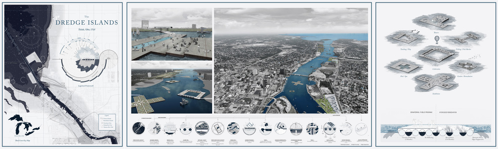 Approximately one-third of the overall dredged material from the Great Lakes Basin originates from the Maumee River near Toledo, Ohio. Due to increasing ship sizes and port activity, decreasing water levels, and challenges with upland sediment management, the dredging of the river will continue indefinitely. This proposal examines what to do with this large amount of dredge material and asks how it can do more for the city. Using a series of dredge processing islands, the project examines new ways to cohabit the riverfront with regional industry and public programming. Employing a series of geotubes to dewater the dredge material, these floating pontoons are fitted with temporary public programs. Located within close proximity to the city where they can be an asset, the continual dispatching of new islands offer an iterative form of public-space making within the geologics of dredge. Once dewatering has occurred, the geotubes are opened and hydro-seeded to remediate the sediment for open-lake placement. The geotubes are eventually tugged into the bay where the sediment is mixed with bentonite and water to form a slurry that suppresses and absorbs algae growth. Incrementally distributed throughout Lake Erie, over several years this process is anticipated to return the lake to its original nutrient composition. In the context of mid-sized cities where low land values, productive industry along the water, and an associated depravity of public space collide, a system of producing land in a malleable, temporal, transformable, and transportable logic enables the symbiotic cohabitation of industry, culture, and ecology. This positions land not as a commodity to capture and hold, but rather as a temporal material state that is iteratively deployed and used by locals and then redistributed to a territorial ecology.