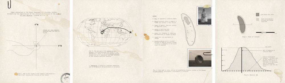 I recently came across these documents during my research at the Royal Geographical Society in London. The papers detail the exploration of the enigmatic Island of Lost Objects. Located at 0.00°N 0.00°E, the Island marks the world’s geographical cipher, the null point. Uncannily, it seems that the island was not always at its current location. I was astonished to find that it had previously been located at the antipodal point, its geographical Other. At its former location it was known as Howland Island, and is still shown as such on some maps. It is a flat, uninhabited island, forlorn and windswept. Not only is the Island a kind of phantom, it is now non-existent Other persists as an after-image. There is an irresolvable sense of presence and absence, investing the Island with an aura of loss. The documents recounted a number of curious elements on the island. A well is mysteriously noted as being ͞of seemingly infinite depth,͟ perhaps an extreme type of a wishing well. An altar and a beacon were further signals of hope in the face of loss. Alongside these votive elements of hope, were various forms of searching: a lookout tower, an acoustic mirror, and a perimeter track worn into the ground from scouring the horizon. It struck me that these practices of hoping and searching were all futile rituals, unlikely to yield a result. Instead, I realized—however perverse this might be—that the island is a place for the love of loss, for the prolonging of longing. Its own absence from its origin amplifies this. The island is evidently for the contemplation of all lost objects: love, civilizations, innocence, missing persons, MH370, passenger pigeons, the Great Buddha of Bamiyan. The endless litany of lost objects, the gaping lacunae in our lives – extinctions, misplacements, destructions, death.