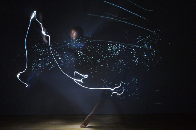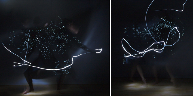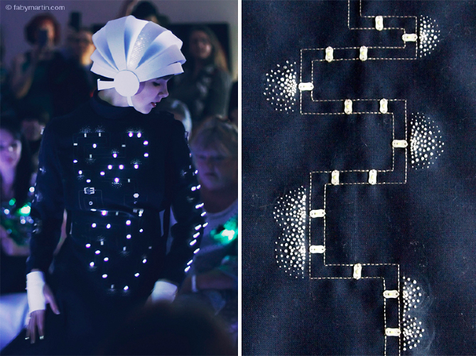 Designed with a dancer in mind and modified from a vintage 1960s pattern, the garment has been hand embroidered to showcase the technological system used, with accelerometers placed on the shoulders, hips and ribcage. While dancing, the body’s movements become (literally) highlighted with light.