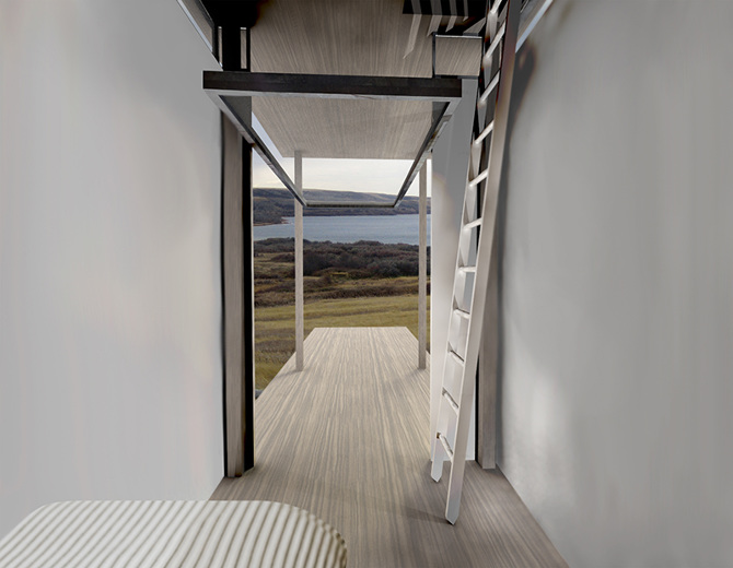 The design for this room is comprised of 3 distinct spaces: an enclosed, private sleeping area on the ground level; a bright, open space for reading, painting, and practicing yoga; and a roof terrace that allows one to fully experience the view to the South.