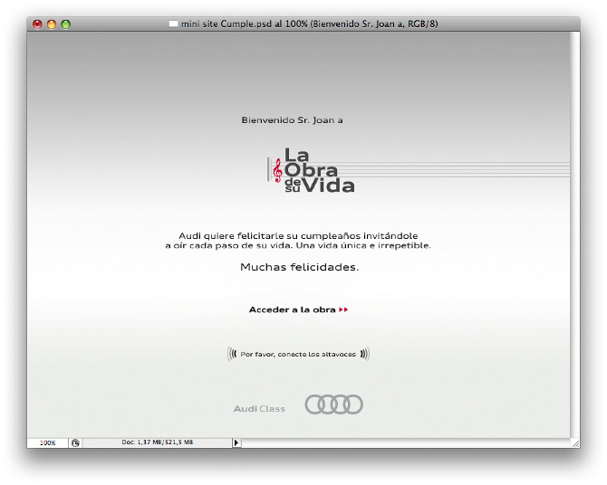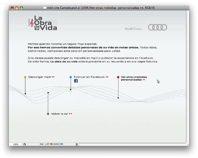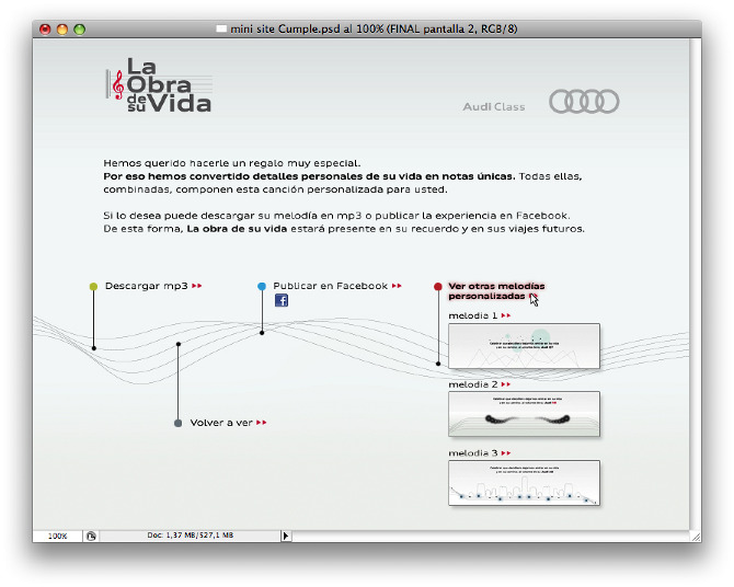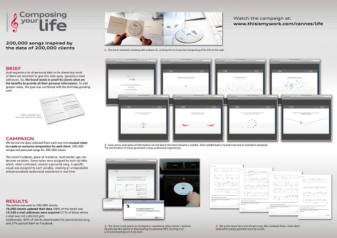 La campaña se basa en un concepto que requiere de una tecnología digital muy precisa. Cada dato personal de cada cliente se convirtió en una nota. Esas notas, combinadas, formaban una canción única y personal. 200.000 canciones para 200.000 clientes. A la música se añadía una serie de visuales también personalizados con cada dato. Edad, lugar de nacimiento, modelo de Audi o aficiones, entre otros, se convirtieron en experiencias audiovisuales únicas. Tan únicas como lo es la vida de cada individuo. A aquellos clientes que no habían proporcionado nunca su email se les solicitaba tras una experiencia no sólo emocionante, sino que demostraba que poseer esos datos es una experiencia de valor para todos.