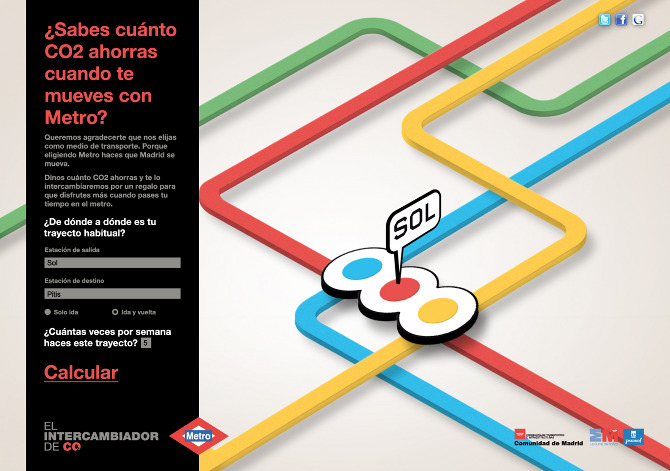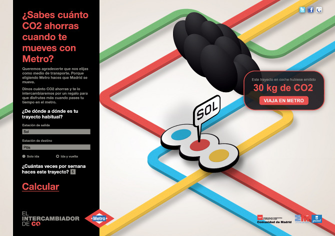 Mediante un microsite que permanecerá dentro de la página de Metro, preguntaremos a la gente “Cuál es su trayecto habitual y Cuántas veces lo hacen a la semana” Les informaremos de la cantidad de CO2 que hubiese generado si hubiese hecho ese trayecto en metro.