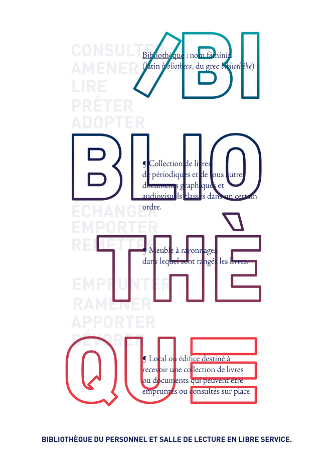 Création d'affiche pour la bibliothèque du personnel et salle de lecture en libre service, dans le cadre de mon stage à la Direction Régionale des Affaires Culturelles PACA, sous la direction de Catherine Cauche.