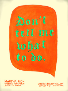 Don't tell me what to do August 6 - 27, 2015 Wieden + Kennedy Gallery 224 NW 13th Avenue Portland, OR Opening Reception August 6, 2015 6-9 pm