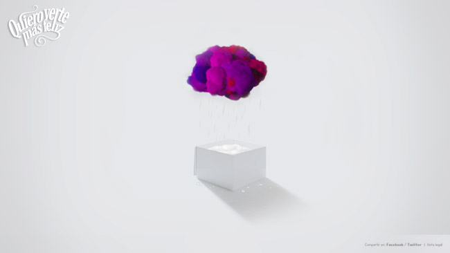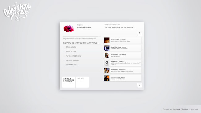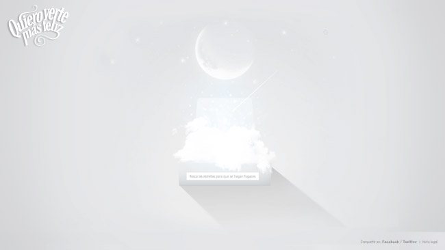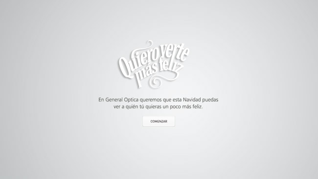 Campaña de Navidad de General Optica "Quiero verte más feliz". Microsite para regalar 20 cajas llenas de sensaciones a tus contactos de Facebook o Twitter. Las cajas contenían desde un "Pompero" para hacer pompas de jabón con el microfono, hasta un "Desfibrilador de estrés" para relajarte arrancando el césped de una montaña.