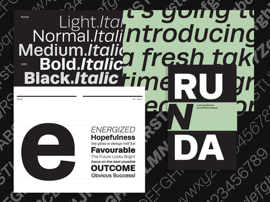 About: Runda is available in five weights with matching italics. With its simple shapes, open forms and elegant execution - Runda communicates any message with clarity and confidence. It is efficiently crafted to work well in all type sizes along with an established range of weights making it useful in a wide variety of applications.