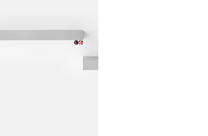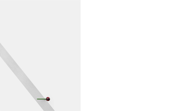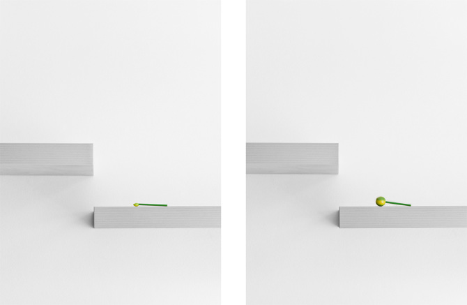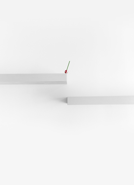 Bunte Lollis turnen in der Serie „daily exercise“ auf zwei Regalbrettern. Sie stehen, liegen, balancieren und bringen in ihrer sportlichen Beweglichkeit ein heiteres Element in die zeichnerisch wirkende Fotoarbeit. Es ist vor allem die besondere Aufnahmeperspektive, welche den unerwarteten Aspekten der Dinge Raum zur Wirkung gibt und zum Beispiel zwei Regalbretter in eine „Bühne für Süßes am Stil“ (Steffi Schöne), zu verwandeln vermag. „Man könnte mir einiges vorwerfen“, schreibt die Künstlerin „vorsätzliche Täuschung, Verdrehung der Tatsachen, Verleumdung, Lug und Trug. Tatsächlich bauen alle meine fotografischen Arbeiten auf diesen, normalerweise wenig geschätzten, Eigenschaften auf. Es ist eine Flucht nach vorn. Statt der Komplexität realer Situationen vor der Linse fotografisch hinterher zu hinken, mache ich diese Schwäche des Mediums zu meinem Vorteil. Dankbar blendet Fotografie das aus, was meine fragilen Welten stört.“