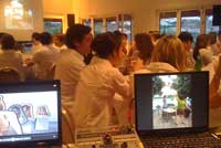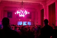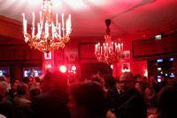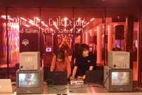 Soirée anniversaire de Charles H avec une scénographie simple et efficace : coloration en rose fushia et installation de moniteurs vidéo dans tous les espaces....