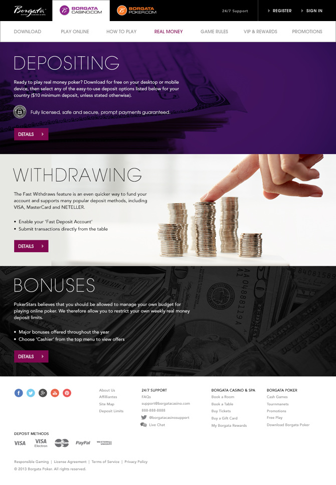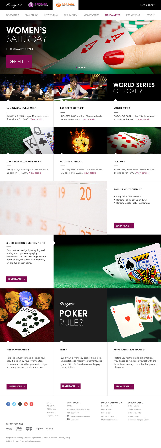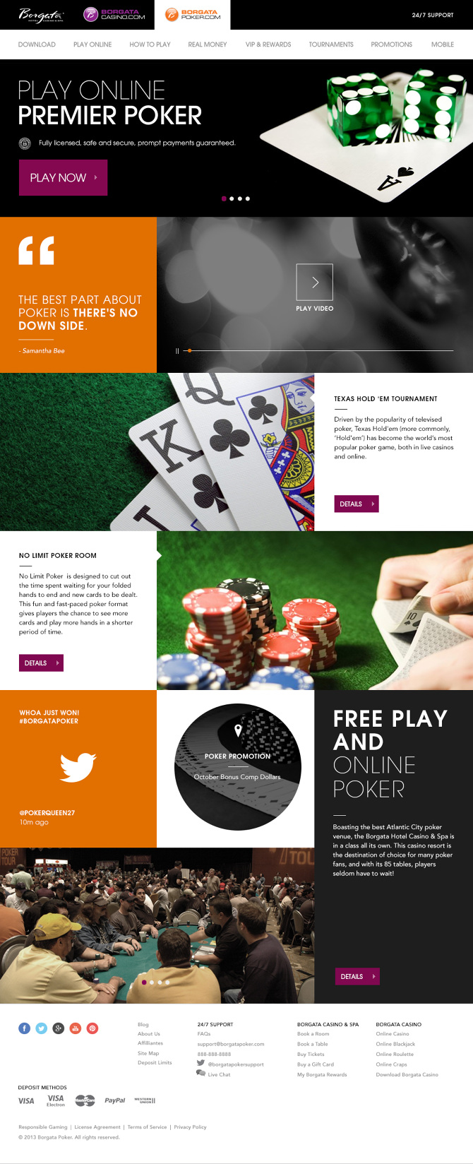 Borgata's online Poker and Casino entities designed from start to finish as online gambling is now legal in the state of NJ. Working in a limited color palette with orange standing for Poker and purple standing for Casino. Created over 30 designs for a custom 250+ page CMS including photography and content management.