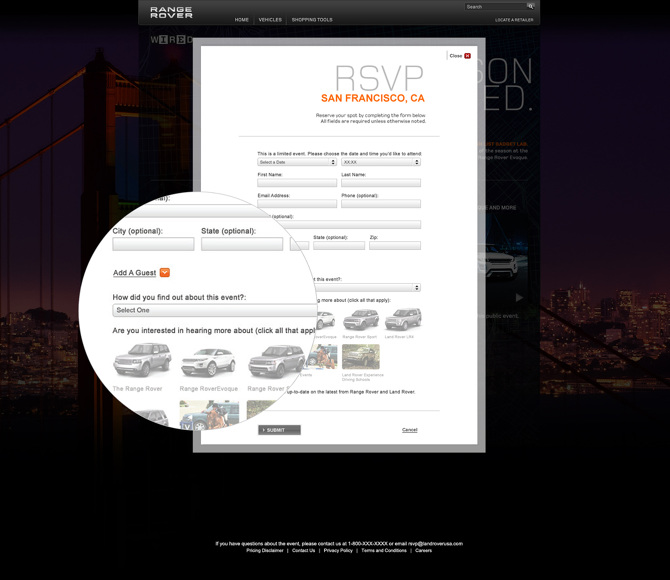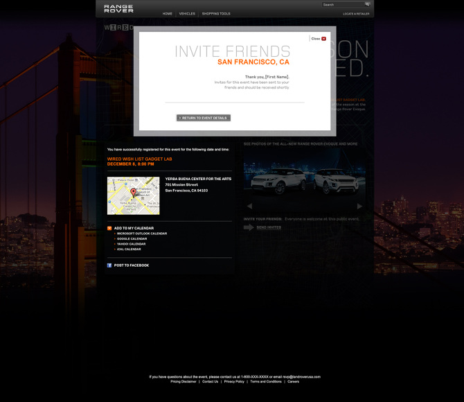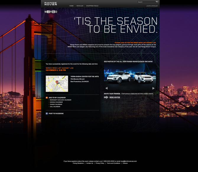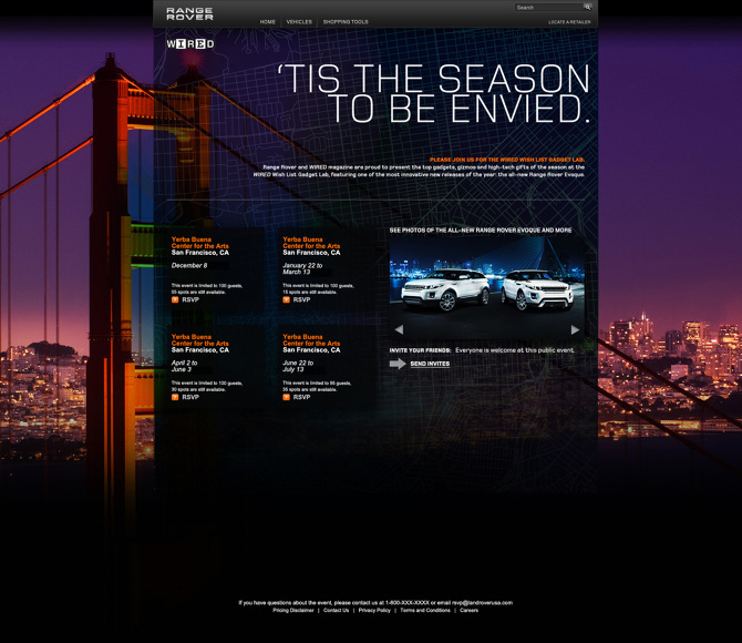 Range Rover's first RSVP microsite for the WIRED Magazine's WIshlist Gadget Lab, exclusively for VIP members. Developed as a tool that dynamically uploads tiles of time and date information of up to six events.