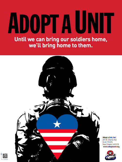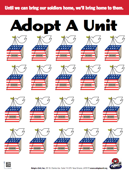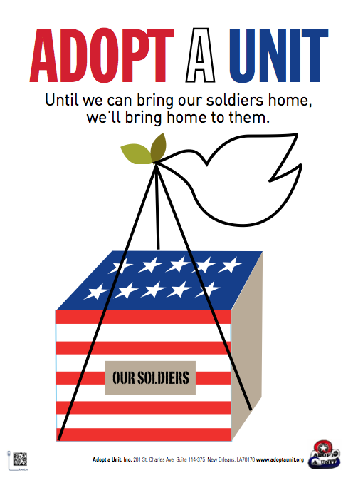Adopt a Unit is a non-profit organization in New Orleans, LA that chooses one military Unit (currently serving overseas) to "Adopt" at a time. Through donations, we purchase various supplies designed to make the soldiers more comfortable and provide them with a taste of home. In an effort to serve ALL of our soldiers’ needs, we ask the unit how many female soldiers they have and are careful to include items geared toward them as well as the men. These generic items commonly include: socks, baby wipes, sports bras, snacks, movies, music, personal care items, etc.