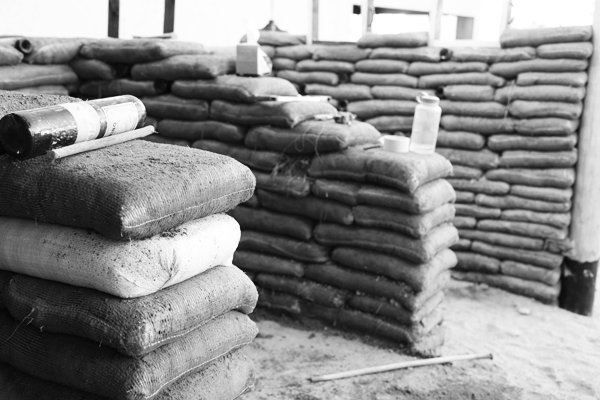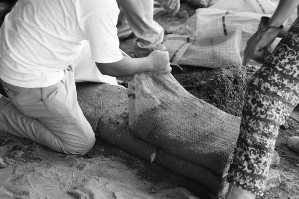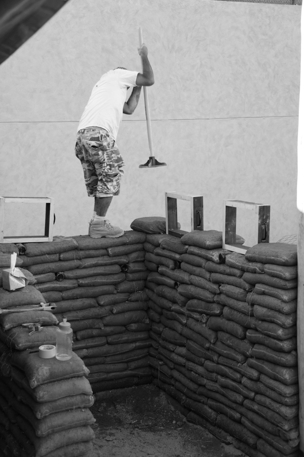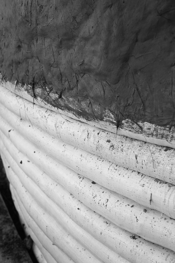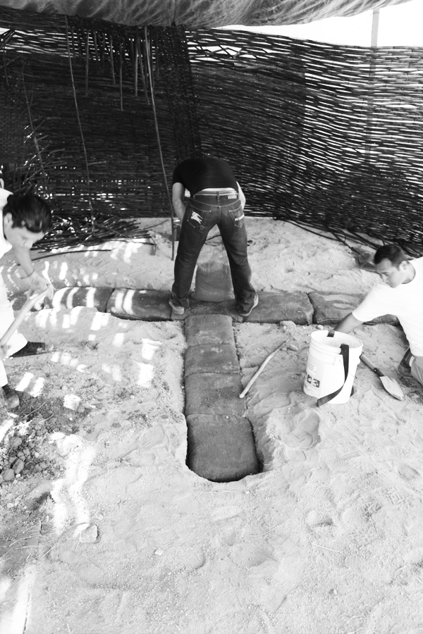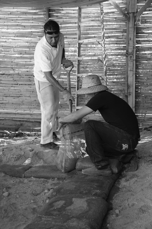 // april 18, 2013 // "We experiment, build, think and rebuild" and lately we've been playing with dirt! Here are some images of explorations with sandbags & super adobe construction systems. (you can also see the use of reclaimed water hoses to fabricate shade and screens)