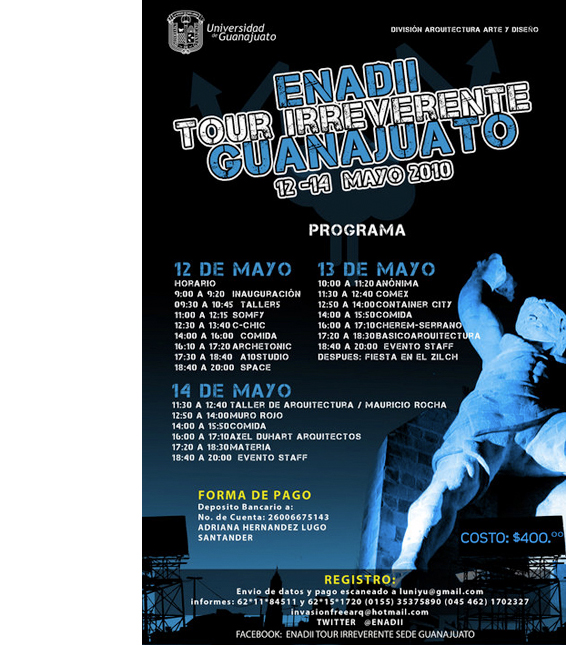 // may 12, 2010 // On May 13th, Mariano Arias-Diez will lecture at the Universidad de Guanajuato as part of the ENADII 2010 "irreverente" tour Guanajuato, México.