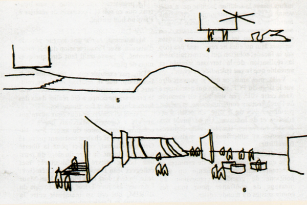 …During the 1960s this idea of the ground as a "terra incognita" gradually began to change. If up to now "Ground Space" had only been defined negatively (as a negative volume between the building and ground level), it is now increasingly seen as a "habitable condition". Interestingly, Le Corbusier was once again a pioneer of this development. In his later constructions, such as The Couvent de la Tourette (57-67) and the Carpenter Center for the Visual Arts(61-64) this new evaluation of the ground is already announced, but perhaps it is to be seen in its most radical form in the unbuilt Electronic Calculation Center Olivetti (1963).