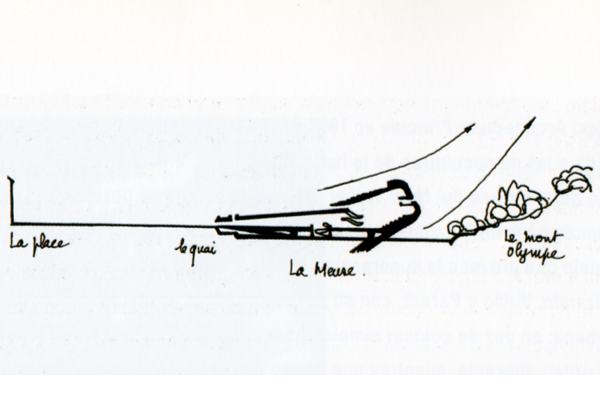 It is precisely this spaces that was coming top the fore of architectural research when Paul Virilio and Claude Parent founded their "Architecture Principe" group in 1963 -same year that Le Corbusier designed his Olivetti-Project. Their point of departure was to fight the monocultures of the horizontality such as Frank Lloyd Wright's Broad-acre City ('35) and the absolute verticality of the New York Skyscraper, yet their position was also contrary to the contemporary metabolic utopias of Constant, Yona Friedman, Domenig/Huth, among others. Virilo and Parent invent with their "Fonction Oblique" a conceptual model for achieving urban continuity: Instead of simply putting a new city on top of the old one, they transfigure the existing ground into a new order, letting the new city emerge out of the old one. In accordance with Virilio's idea of "habitable circulation", all surfaces are multi-programmed. Their venture found little or no following in french architecture, however, it did provide a decisive impulse for the international debate, the constructed results of which were, paradoxically, first seen in France. In 1967 Oscar Niemeyer was commissioned by the French Communist Party to build the new headquarters for their central committee. His project seemed to further develop the ideas of Parent and Virilio, who were to end their partnership one year later… In a spatial mise-en-scène charged with suspense like a Hitchcock movie, Niemeyer gives the ground a form, and extension and a location.