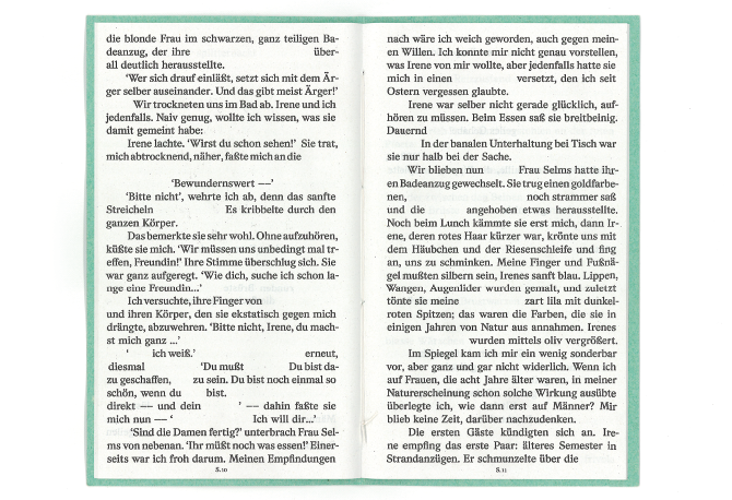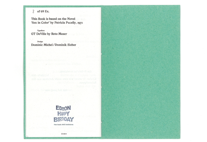 SEX IN COLOR VOL.1 — A new interpretation of a superficial erotic novel out of the 70s. After different changes in text and style and the adding of a series of photographies this publication should highlight the triviality of the source. In collaboration with