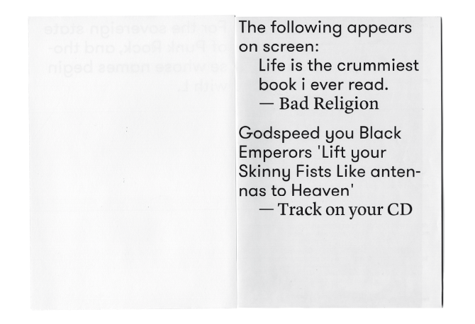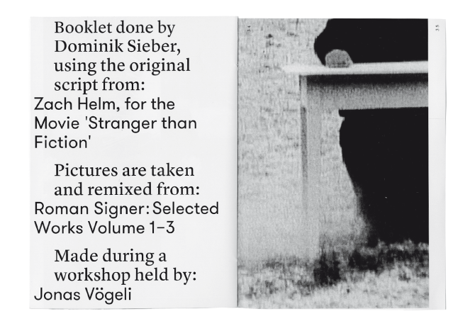 STRANGER THAN FICTION — The Original Screenplay of the movie "Stranger than Fiction" was mixed and remixed with pictures of Romans Signers Art. The Booklet was made during a Workshop held by Jonas Vögeli. Font: GT Walsheim by Noel Leu.