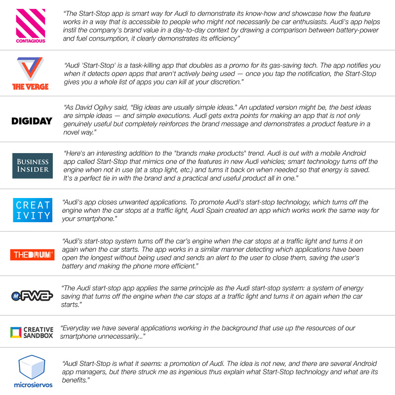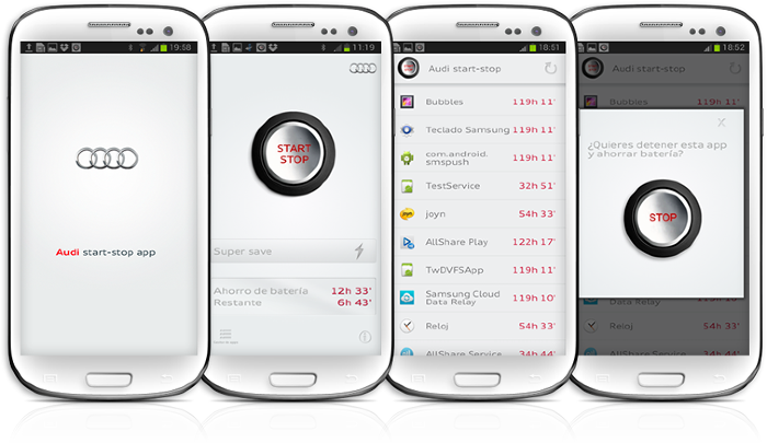 Everyday we have several applications working in the background which use up the resources of our Smartphone unnecessarily. To solve this, we’ve created the Audi start-stop app, an app which applies the same principle as the Audi start-stop system: a system of energy saving that turns off the engine when the car stops at a traffic light and turns it on again when the car starts. So we made this simple app that uses this same principle to save phone battery. The app detects which applications have been open longest without being used and sends an alert to the user to close them. This way it saves battery and makes the phone an even more efficient tool.